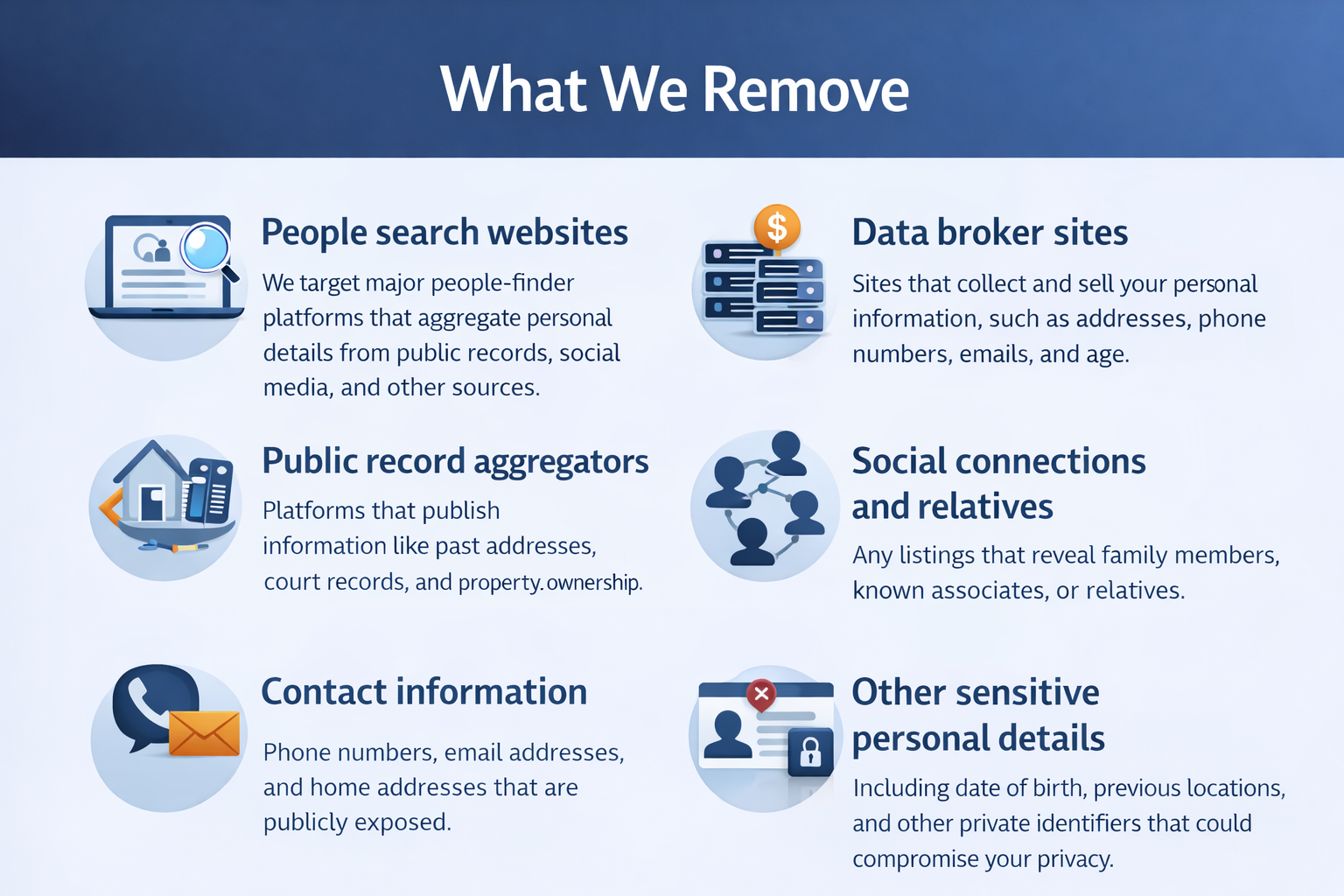 We perform a thorough search to identify all the websites and platforms where your personal information appears. This ensures no exposure is overlooked.