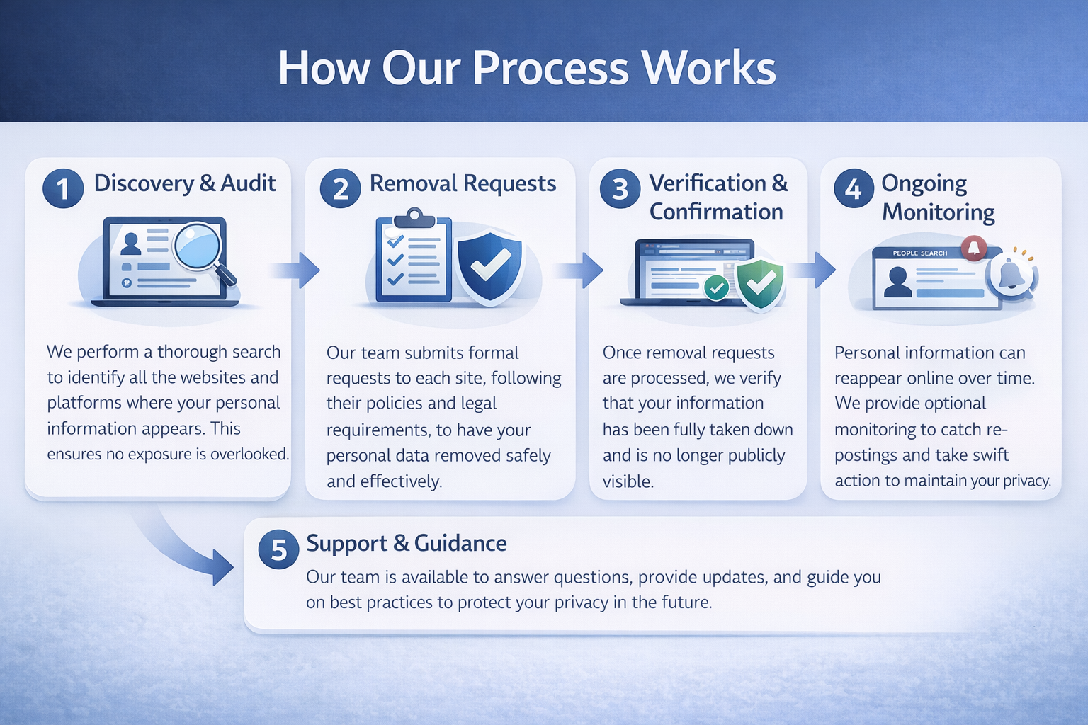 Our team is available to answer questions, provide updates, and guide you on best practices to protect your privacy in the future.